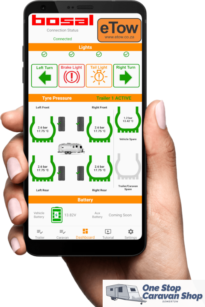 Bring your Caravan into the modern age with the eTow system. The eTow has 3 components, the eTow App, device and wiring harness. The device and wiring harness should be fitted by an approved fitment centre. You no longer need to physically check you tyre pressures, exterior lighting, or battery. eTow will send you a notification when your lights fail, your tyre pressures are low or your battery voltage is below 12 volts.