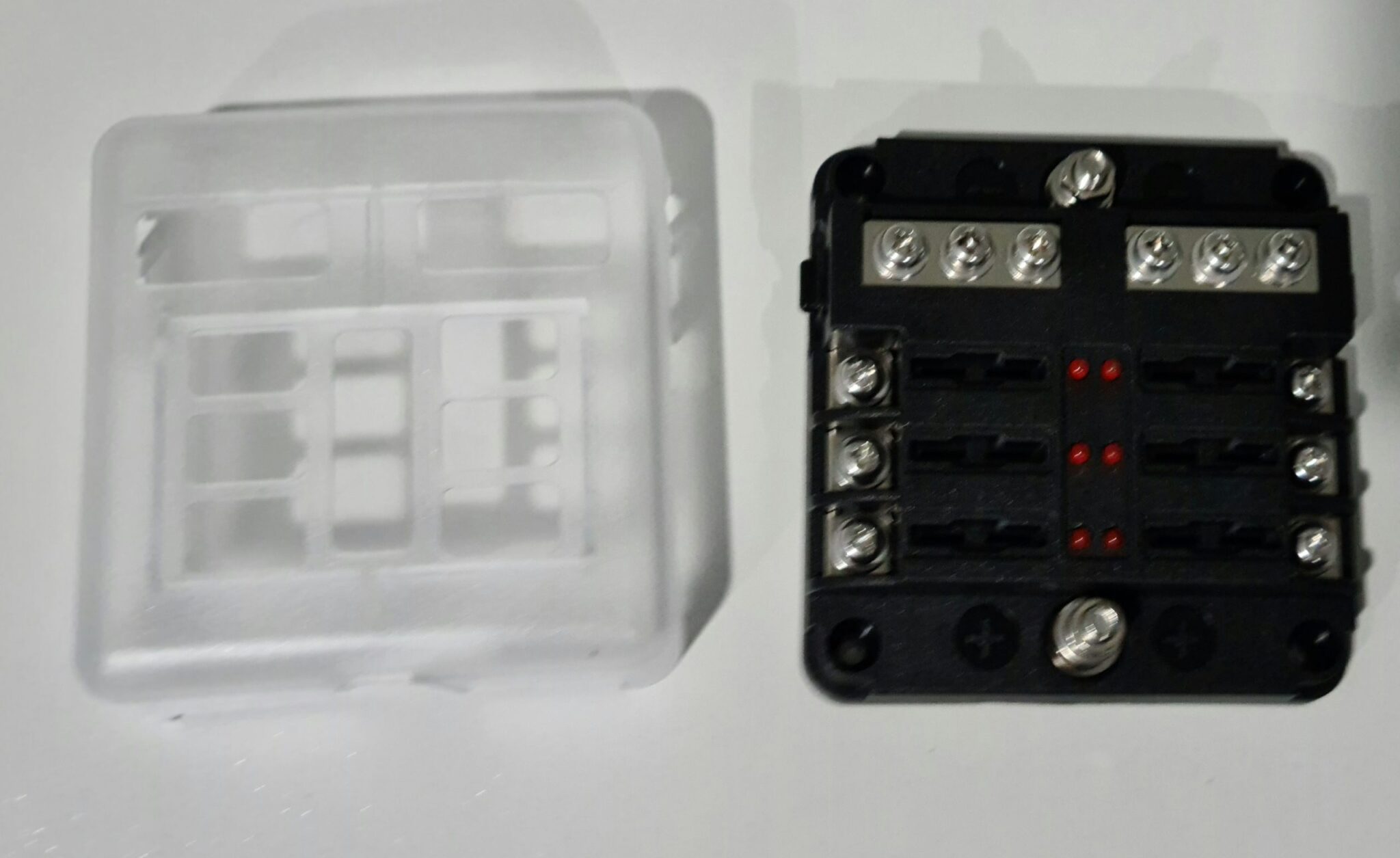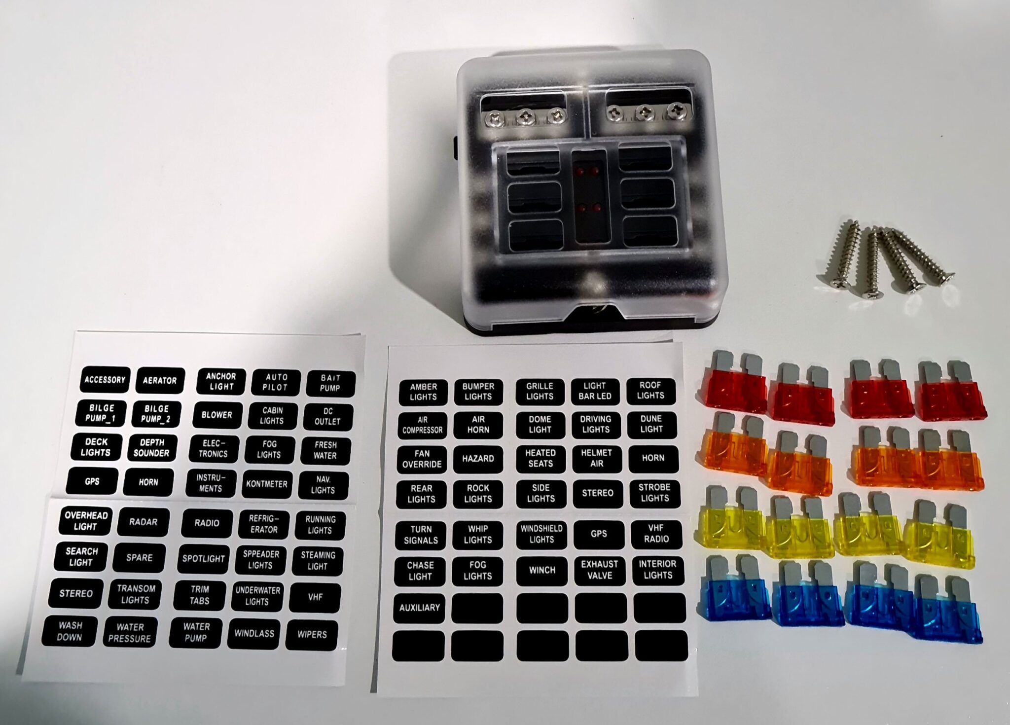 - 6-circuit ATC/ATO/ATF blade fuse block; max 30A per circuit.