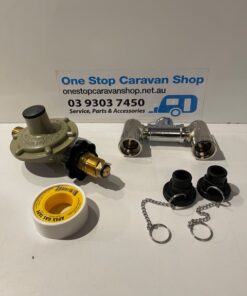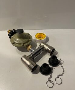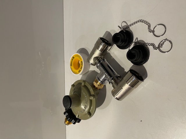 Gas bayonet adaptor twin with regulator and dust caps for LPG gas bottle.